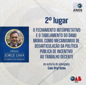 O advogado ilheense, Caio Pryl Ocke, foi um dos premiados ao ter ficado em 2° lugar, concorrendo com colegas de todo o estado. Esta foi a primeira edição do prêmio que busca homenagear o advogado Jorge Lima, ex-presidente da Associação Baiana dos Advogados Trabalhistas e ex-conselheiro da ordem, falecido em 2020.
