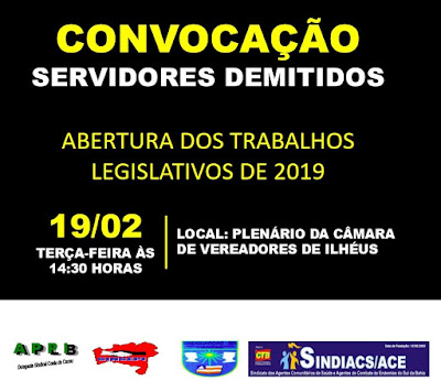 Na próxima terça-feira (19), às 14h30, a Câmara de Vereadores de Ilhéus inicia os trabalhos legislativos de 2019. Nesse sentido, os sindicatos representativos dos funcionários do município convocam trabalhadores que foram demitidos pelo prefeito Mário Alexandre, o Marão, para ocuparem o plenário da Câmara.