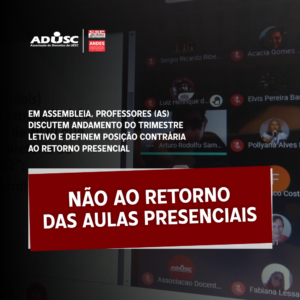 A assembleia também pautou o andamento do trimestre excepcional. Um dos assuntos mais comentados pelos (as) professores (as) presentes na reunião foi a dificuldade estrutural para realização das aulas remotas. Diante disso, foi solicitado um parecer da Assessoria Jurídica da ADUSC sobre a obrigação da UESC em fornecer auxílios que compensem os gastos referentes ao trabalho remoto: