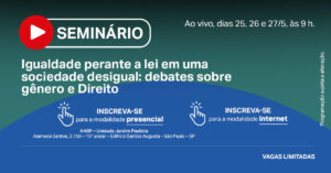 A Associação dos Advogados de São Paulo – AASP, promoverá nos próximos dias 25, 26 e 27/05, às 09h, o seminário “Igualdade perante a lei em uma sociedade desigual: debates sobre gênero e Direito”. O evento será em formato hibrido (presencial e online) no presencial o evento ocorrerá na Unidade Jardim Paulista da AASP, Alameda Santos, 2.159, 15º andar, Edifício Santos Augusta. O seminário é uma promoção da AASP com o Núcleo Gênero e Direito da FGV-Direito.