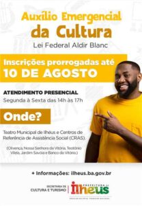 Agentes e entidades culturais de Ilhéus, sejam pessoas físicas, com CNPJ ou entes despersonalizados que ainda não realizaram o cadastramento para pleitear o Auxílio Emergencial federal pela Lei Aldir Blanc, podem fazer até o dia 10 de agosto. A Secretaria Municipal de Cultura e Turismo (Secult) de Ilhéus, com o objetivo de contemplar o maior número de pessoas para que o benefício seja buscado, prorrogou o prazo que antes estava para até o dia 31 de julho.