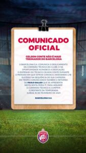 O BARCELONA DE ILHÉUS COMUNICA  DESLIGAMENTO DE GELSON CONTE E TODA COMISSÃO TÉCNICA. O NOVO TÉCNICO PAULO SALLES SE APRESENTA NESTA SEXTA-FEIRA, 17.