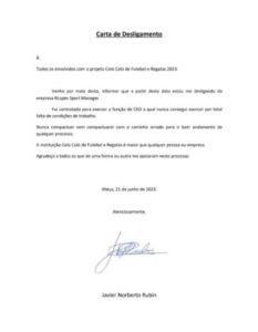 Tudo que começa mal com a Global, acaba bem pior com a RLopes, agora foi a vez do CEO Javier Norberto Rubin desta empresa que administra o futebol do clube pedir seu desligamento por motivos que todos tinham conhecimento.