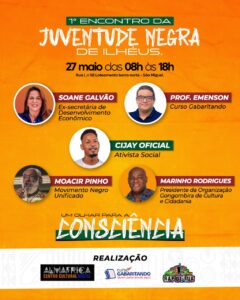 Participantes – As palestras serão ministradas pela ex-secretária de Desenvolvimento Econômico e Inovação de Ilhéus, Soane Galvão; pelo ativista social, Cijay; pelo presidente da Organização Gongombira de Cultura e Cidadania, Marinho Rodrigues; pelo representante do Movimento Negro Unificado, Moacir Pinho; e pelo diretor do Curso Gabaritando, Emenson Silva.