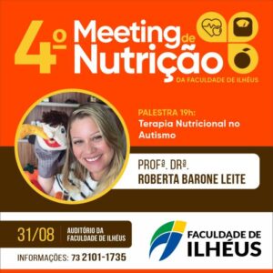 Às 19 horas, a abertura será com a palestra sobre o tema Terapia Nutricional no Autismo, com a professora doutora Roberta Barone Leite, nutricionista graduada pela Universidade Federal da Bahia (Ufba), com residência em Nutrição Hospitalar Pediátrica pelo COM-HUPES/Ufba. É mestra em Medicina e Saúde pela Faculdade de Medicina da UFBA, doutoranda em Alimentos, Nutrição e Saúde pela Escola de Nutrição da UFBA, com tese em Autismo. Além de membro da Comissão de Inclusão à alimentação saudável para pessoas com deficiência do Ministério Público da Bahia e avaliadora do Sistema Nacional de Avaliação da Educação Superior do Ministério da Educação (MEC).