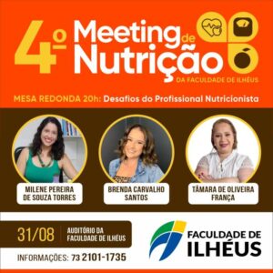 O 4º Meeting de Nutrição da Faculdade de Ilhéus será realizado no dia 31 de agosto, a partir das 19 horas, aberto a estudantes, professores e profissionais da área. Promovido pelo colegiado do curso de Nutrição, o evento contará com uma palestra e uma mesa redonda, com temas específicos.