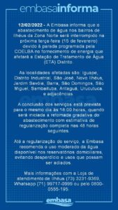 A Embasa informa que o abastecimento de água nos bairros de Ilhéus da Zona Norte será interrompido nesta terça-feira (15 de fevereiro) devido à parada programada pela COELBA no fornecimento de energia que afetará a Estação de Tratamento de Água (ETA) Distrito.