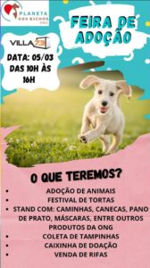 A ONG Planeta dos Bichos promove no próximo sábado, dia 5 de março, uma feira de adoção de cães, das 10h às 16h, no espaço Villa 73, localizado no estacionamento do GBarbosa, Pontal. De acordo com Maria da Conceição Barbosa (Ceiça), presidente da ONG, para adotar os animais, que estão castrados e vermifugados, é necessário ser maior de idade, apresentar documentos pessoais e comprovante de residência.