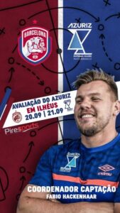 O Barcelona recebe nesta quarta-feira, 20/09, o observador do Azuriz clube formador de atletas do Paraná, mas, que também joga a séria A daquele estado, Fábio Hackenhaar, à convite do gerente da base do Barcelona de Ilhéus, Renato Peixoto.