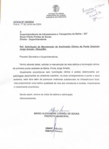 O prefeito de Ilhéus, Mario Alexandre (PSD), em parceria com a deputada estadual Soane Galvão (PSB), assinou e enviou requerimentos à Superintendência de Infraestrutura e Transportes da Bahia (SIT), solicitando a manutenção da rede elétrica e da iluminação cênica da Ponte Estaiada Jorge Amado, além de maior celeridade nas obras de duplicação da BA-001 e na requalificação da Zona Norte.