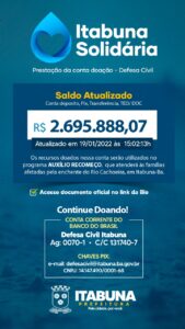 A Prefeitura de Itabuna e Banco do Brasil atualizaram nesta quarta-feira, dia 19, saldo da conta corrente Defesa Civil Municipal n° 131.740-7 agência 0070-1, Pix n° 14147490000168, de titularidade do município. Até as 15:02:13 do dia 19/01/2022 é de R$ 2.695.888,07 (dois milhões,